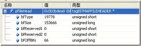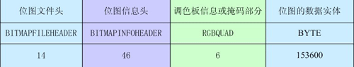 位图文件头:从这里面了解到位图文件相关信息,文件类型为19778(即位图的文件类型编号:0x4D42),文件大小为153666,位图数据实体偏移文件头部66。