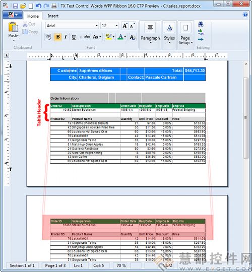 表可以用于展示报告中大量的数据,表上任何一页的最大长度,只能是该页面的最大长度(减去页边距,页眉和页脚),每次分页时就需要分表。有了TX Text Control .NET v16.0后,分页时表中的任何一行都可以被自动添加到每个表上,这确保了每一页表无论多长都有表头。