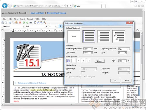使用TextControl,可以构建与Windows 窗体功能相同的基于浏览器的应用程序,这包括加载和保存文件至所支持文件格式的客户机。有了TX Text Control .NET v16.0你可以建立 一个完整的Internet Explorer文字处理应用程序。