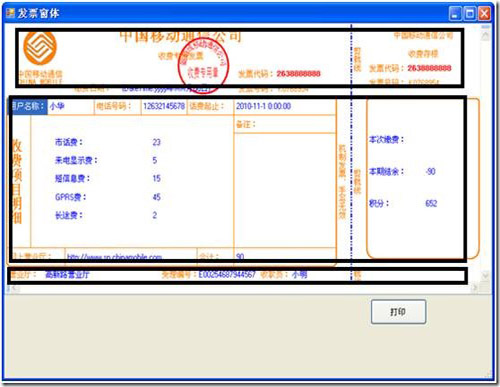 创建这样的模板分为三个部分,ColumnHeader作为发票头显示公司名称以及其他发票信息,Row部分是主要内容显示一些明细,ColumnFooter是一些额外信息显示营业厅收款员信息,请看下图的三个黑框部分,从上到下分别代表ColumnHeader,Row,ColumnFooter: