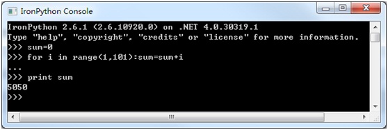 举个简单的例子,图 2所示为使用IronPython[2]编程计算“1+2+……+100”的屏幕截图,我们可以快速地输入一段完成累加求和的代码,然后马上就可以看到结果: