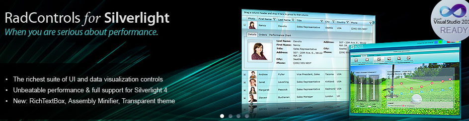 RadControls for Silverlight 是著名的保加利亚 telerik软件公司发布的Silverlight用户界面控件套包产品,telerik是一个发展非常快速的公司,其专注于微软.Net平台的表示层与内容管理控件。其下产品多次获奖,获得广大用户的认可。RadControls for Silverlight,目前最新的版本是2010 Q1,支持.NET 3.5 SP1/Visual Studio 2010/Expression Blend;RadControls for Silverlight包含了用户界面中44个功能控件,总共超过100个子控件。具体包括:仪表盘、编辑器、表格、导航、预览、窗口、编辑器(代码编辑器)、Ribbon、元素库等功能子控件。
