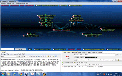 可以看到,目前的关注焦点在 Hotchkiss & Ronen, 2002 这篇文章上,这在 PersonalBrain 中被称为一个 Thought。每个 Thought 都可以添加无数附件,我只把这篇文章的 pdf 文件放入了附件,只要点击 Thought 内的 pdf 图标,论文就会自动打开。左下角是这个 Thought 的附注,支持富文本格式(RTF),我读这篇文章后简单地记录了一些当时的想法。