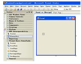 1. 创建一个标准的WinForm工程,从工具栏中找到“WPF Interoperability”项目,选择其中的ElementHost,将其拖拽到Form中,如图1所示: