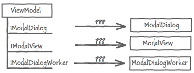 最后一个问题是怎么把接口IModalDialog, IModalVIew 和IModalDialogWorker的实现潜入到ViewModel中,看下图