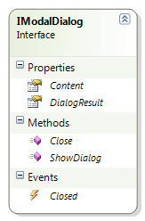 从上图可以知道必须定义一个属性DialogResult,其作用就是确定View层上确定或者取消按钮是否被点击。还必须定义两个方 法:Close和ShowDialog,两个方法的作用是关闭和显示模式窗口。当模式窗口被关闭时,还需要一个事件Closed来处理后续的操作。最后, 还需要一个属性Content,这个属性非常的特殊,为什么这样说呢?可以有两种方法来实现。