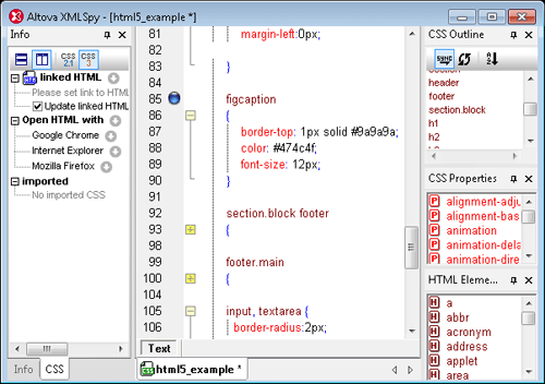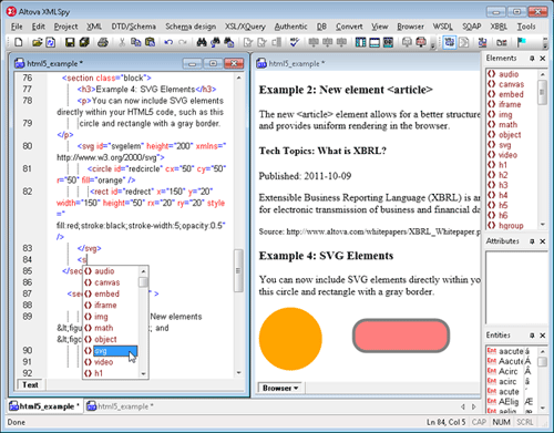 XMLSpy一直以来都支持HTML4和XHTML编辑,甚至包括一个智能型的CSS编辑器。XMLSpy 2012版本引入了智能支持,即编辑HTML5时的智能代码提示。XMLSpy HTML5 编辑器在静态化输入助手窗口和下拉菜单中提供了上下文敏感编辑帮助,你可以轻松地在XMLSpy HTML5 编辑器中编写代码。另外,代码完成有助于加快编辑以及确保关闭元素。