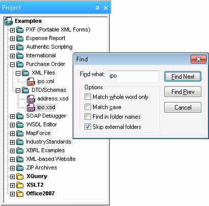 XMLSpy中的在“文件中查找”以及“在架构中查找”功能已经被扩展到了XMLSpy项目:输入你所需要查找的文件名,XMLSpy便会立即查找到你所查找到文件。在“项目中查找”的这项功能使你在复杂的项目中查找所需文件更加容易和高效。