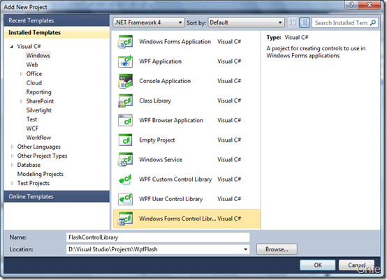 在工程中新增一个Windows Forms Control Library 项目(FlashControlLibrary),利用该控件库加载Flash ActiveX。