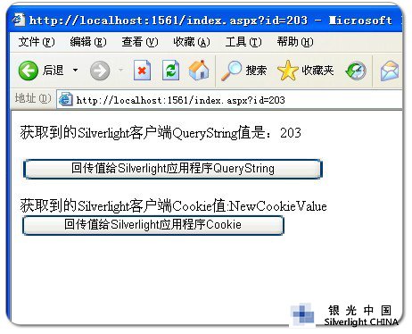 实现思路:在Silverlight端跳转到页面到Index.aspx并且传递一个QueryString参数ID,在该Index.aspx页面显示出ID。在Index.aspx页面有一个按钮可以向Silverlight所在页面传递一个参数aspxid,在Silverlight端读取aspxid参数并且显示出来。