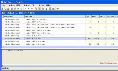 SQL Profiler是最容易被忽视的工具,而这个工具是数据库性能优化一个非常强大的工具,它与Management Studio在SQL Server安装时都会绑定在一起,选择新建跟踪,然后在跟踪属性中选择相应的事件列,一般选择CPU、Reads、Writes、Duration、StartTime、EndTime即可,它们对应了在物理上SQL语句对CPU的占用、对硬盘读写的次数和起止时间,通过它可以很直观地看出影响SQL性能的地方。