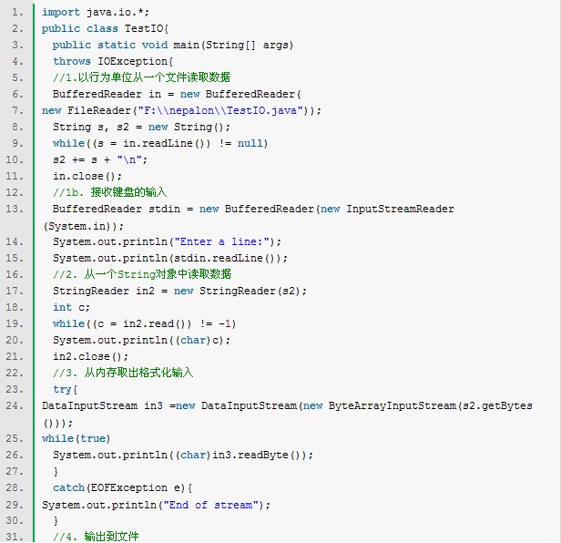 运用上面介绍的Java中操作IO的API,我们就可完成我们想完成的任何操作了。但通过FilterInputStream和FilterOutStream的子类,我们可以为stream添加属性。下面以一个例子来说明这种功能的作用。