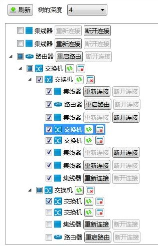 从 两段代码可以看出,WinForm实现代码是事件驱动,首先触发一个事件,然后进行一些逻辑判断,而且还需要借助全部变量IsClick来防止代码无限递 归。而WPF的实现则是靠数据驱动,数据变化了,然后才调用方法来更改数据的相应状态。最后才通知界面刷新数据。其实可以看出现在的需求很简单就是,根据 节点选中状态操作树,但是如果我的需求变化了,例如图1-2的需求一样,如果我需要打钩的时候,操作按钮的状态,比如打钩就连接,不打钩则断开。 WinForm的话又要在代码中做一些逻辑判断,这很容易实现,但是如果我断开按钮按下的时候,只能点击连接,这时候WinForm的事件就要做很多逻辑 处理,如果需求要求的功能多的话,事件的后台代码将越来越复杂,最后导致逻辑混乱。而WPF实现的话,则是根据数据变化而且在界面上显示,当我点击的时 候,修改下数据的状态则可以。后台无需要做太多的处理,这样代码结构和逻辑会变得相对清晰。