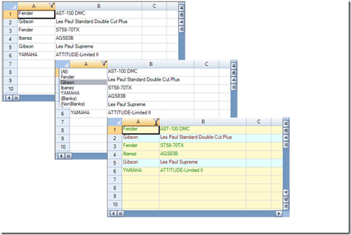 // 定义应用于筛除行的样式. FarPoint.Win.Spread.NamedStyle inStyle = new FarPoint.Win.Spread.NamedStyle(); FarPoint.Win.Spread.NamedStyle outStyle = new FarPoint.Win.Spread.NamedStyle(); inStyle.BackColor = Color.LightCyan; inStyle.ForeColor = Color.DarkRed; outStyle.BackColor = Color.LemonChiffon; outStyle.ForeColor = Color.Green; // 为第一列创建新的筛选设置(使用默认设置). FarPoint.Win.Spread.FilterColumnDefinition fcdef = new FarPoint.Win.Spread.FilterColumnDefinition(0); // 创建一个StyleRowFilter对象(样式筛选器), 并添加到上述筛选设置中. FarPoint.Win.Spread.StyleRowFilter styleFilter = new FarPoint.Win.Spread.StyleRowFilter(fpSpread1.ActiveSheet, inStyle, outStyle); styleFilter.AddColumn(fcdef); // 为表单设置已创建的行筛选器对象。 fpSpread1.ActiveSheet.RowFilter = styleFilter; // 以文本对数据区域进行筛选。 fpSpread1.ActiveSheet.DefaultStyle.CellType = new FarPoint.Win.Spread.CellType.TextCellType(); fpSpread1.ActiveSheet.SetText(0, 0, "Fender"); fpSpread1.ActiveSheet.SetText(1, 0, "Gibson"); fpSpread1.ActiveSheet.SetText(2, 0, "Fender"); fpSpread1.ActiveSheet.SetText(3, 0, "Ibanez"); fpSpread1.ActiveSheet.SetText(4, 0, "Gibson"); fpSpread1.ActiveSheet.SetText(5, 0, "Yamaha"); fpSpread1.ActiveSheet.SetText(0, 1, "AST-100 DMC"); fpSpread1.ActiveSheet.SetText(1, 1, "Les Paul Standard Double Cut Plus"); fpSpread1.ActiveSheet.SetText(2, 1, "ST58-70TX"); fpSpread1.ActiveSheet.SetText(3, 1, "AGS83B"); fpSpread1.ActiveSheet.SetText(4, 1, "Les Paul Supreme"); fpSpread1.ActiveSheet.SetColumnWidth(0, 90); fpSpread1.ActiveSheet.SetColumnWidth(1, 210); |