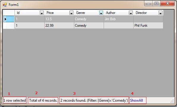 代码中一个是三个事件,dataGridView1_SelectionChanged事件用于在 DataGridView行被选择时触发,用来更新StatusStrip中当前用户选择的总行 数;dataGridView1_DataBindingComplete事件在DataGridView数据完成绑定时触发,用来更新 StatusStrip中Filter的信息及使用Filter之后的数据行数,以及DataGridView的数据总行数,注意其中将 BindingSource的RaiseListChangedEvents设置为false以取得DataGridView数据源中的真实数据行数,之 后再将其设置为true以获取到Filter的相关信息;toolStripStatus_ShowAll_Click事件为用户点击Show All链接时触发,用于移除DataGridView中的Filter。