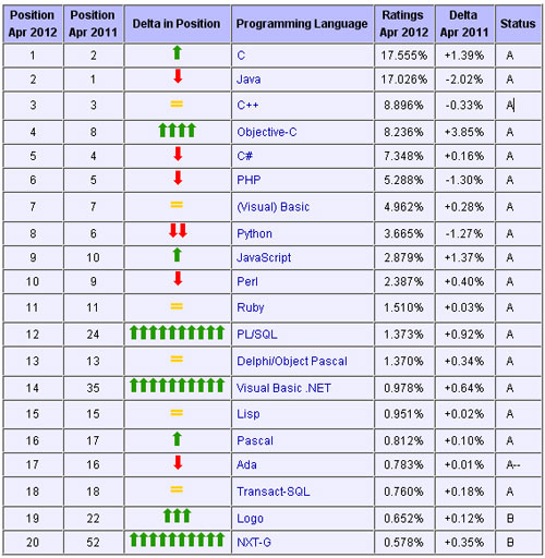 前 20 名其它变化(与 3 月对比):C++重新回归第三,Objective-C也超越 C# 成为第四,C#滑到第五(由8.244% 减少到7.348%)。T-SQL 退步较大,由 14 滑到第 18,份额也有较显著得到减少。