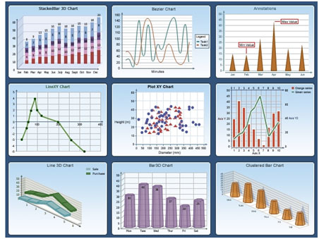 ActiveReports的图表控件支持绝大多数常用的二维和三维图表类型,包括XY表和财务图表。通过使用图表控件的定制功能,如修改坐标轴、图注、图例等,用户可以创建任何其所需要的图表效果。用户还可以通过代码把定义好的图表输出为多种图像格式.
