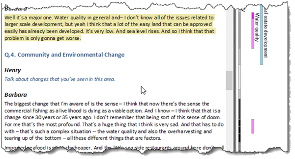 不过您还可以采取进一步的步骤来进行更深入的挖掘。当NVivo链接到原始数据源时,很容易在完整的上下文中查看到这些重叠数据的区域,从而看到语句上的细微差别。但是您也可以使用编码条纹进一步执行此过程。