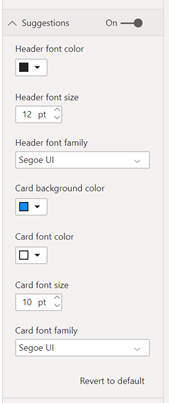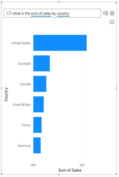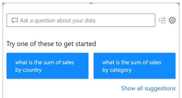 这将把Q&A可视化添加到报告页面,其中有一个输入框供您输入问题和一些建议。单击任何建议都将自动用该问题填充输入框并显示结果。