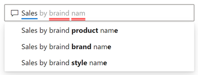 10月版还更新了Q&A问题输入框的用户体验。您将看到我们从您的数据模型中了解的术语上看到蓝色下划线。红色下划线用于表示模棱两可或我们根本不了解的术语。当你选择一个特定的自动提示输入时,也会有一个新的下拉体验,类似于您在网络搜索引擎中获得的建议。