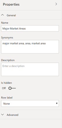 此更新还为行标签(以前称为Excel中可用的默认标签)提供了支持,使您可以定义表的行标识符。要定义行标签,您可以转到建模选项卡,然后单击表名称以查看该选项。同样,如果您希望定义Q&A将使用的同义词,可以使用建模窗格为数据模式内的所有列快速定义所有同义词。