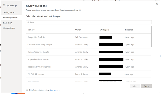 从那里,您将看到Power BI服务中从该数据中提出的问题列表。您可以过滤列表以查看所有问题,也可以仅查看消费者要求您解决问题的问题,以给出更好的答案。如果Q&A不理解这些条款,则将在其旁边带有铅笔,这将带您进入下一节“教Q&A”以进行修复。