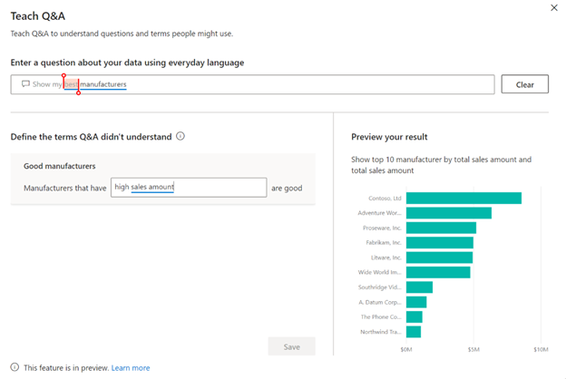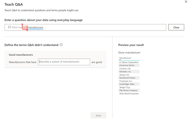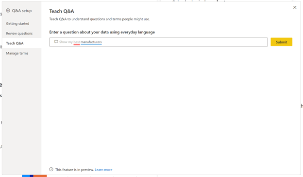 该工具的第二部分使您可以教授Q&A:如何回答模棱两可的问题。您可以先输入“显示我的最佳制造商”之类的问题,然后单击“提交”。