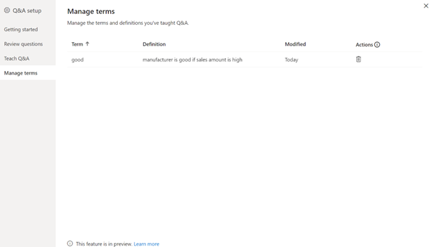 最后一部分允许您通过“讲授问答”部分来管理添加到问答中的条款。您会看到每个术语的定义、创建时间,以及不再需要该术语的选项以将其删除。