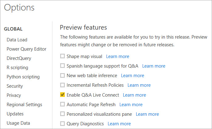 最后,现在通过Q&A支持SQL Server Analysis Services和Azure Analysis Services,使您无需先将数据导入Power BI即可连接到数据。在使用此功能前,必须首先在选项和设置->选项->预览功能中启用预览功能开关。