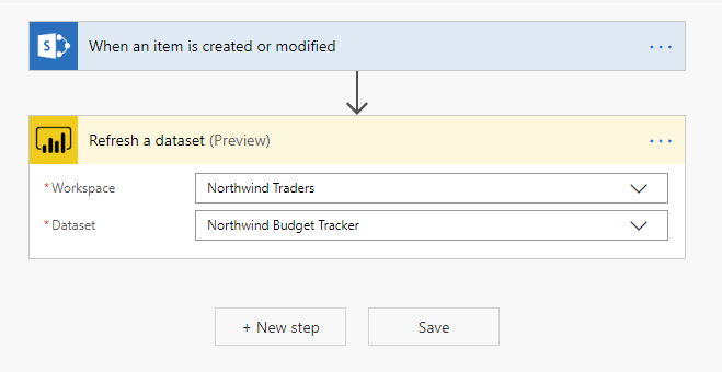 现在,我们进入流的最后一步:选择工作区的名称,然后选择要触发刷新的数据集的名称。在我们的案例中,我们选择了Northwind Traders工作空间和Northwind预算跟踪数据集。