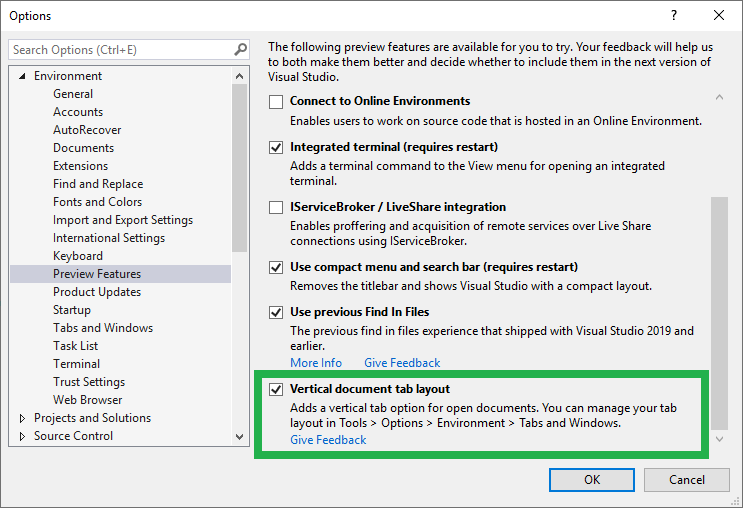 要尝试使用垂直标签,请通过转到工具>选项>环境>预览功能启用垂直文档标签布局功能。启用此功能后,您将可以在“ 工具”>“选项”>“环境”>“选项卡和Windows”下查看垂直选项卡的其他设置,并可以通过“文档”选项卡的右向轻松地在三个方向(左,右和上)之间更改选项卡布局。单击上下文菜单。