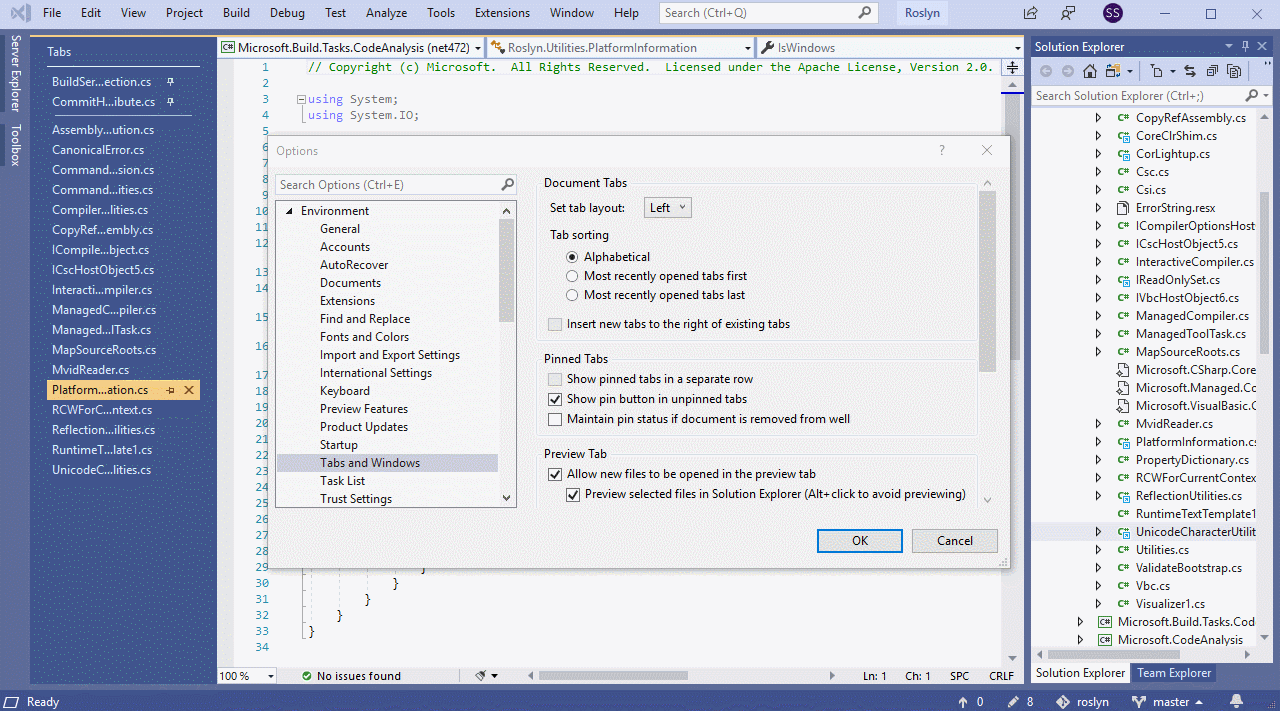 掌控标签的打开方式。除了默认的字母排序之外,Visual Studio v16.4预览版2还添加了通过最近打开的选项卡打开功能。尽管字母排序具有固定的顺序,但是最近打开的页面可让您在打开标签后重新排列标签的顺序。