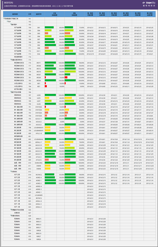 使用葡萄城报表控件——ActiveReports ,可轻松设计树形结构报表,实现维度钻取功能以及设置进度条显示等功能,可快速查看更细粒度的指标数据,如项目施工进度报告等。