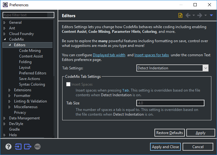 您可以通过设置参数来自定义CodeMix编辑器中的体验。大多数参数可从 Window > Preferences > CodeMix > Editors 中访问。