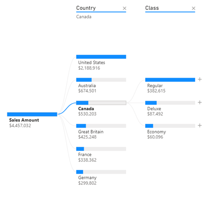 分解树可用于通过查看组中各个类别对整体的贡献来执行根本原因分析。 视觉效果使您可以分解或分解组,以查看其各个类别以及如何根据所选度量(例销售额)对它们进行排名。