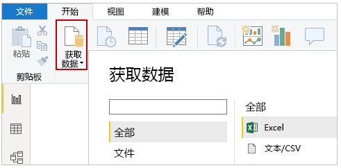 启动Power BI Desktop时,可以从“开始”选项卡上的功能区选择“获取数据”。