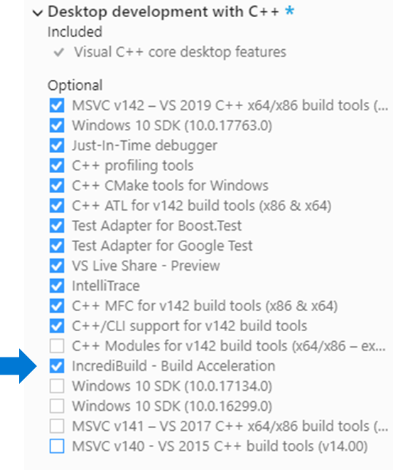 下载Visual Studio 2019安装程序后,IncrediBuild将作为C ++工作负载的可选组件出现。