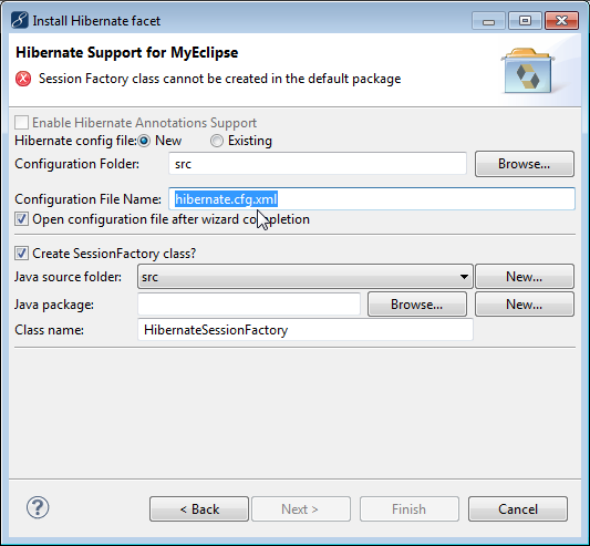 单击“Java Package”字段旁边的“新建”以为session factory类创建新的软件包。键入com.myeclipse.hibernate作为程序包名称,然后单击“完成”。