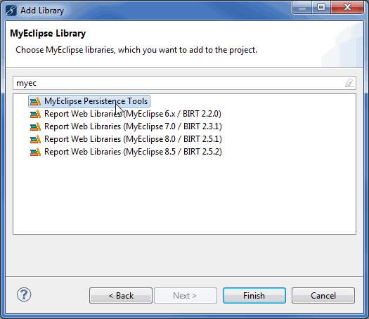 选择MyEclipse Library,单击Next,并选择MyEclipse Persistence Tools。单击Finish。