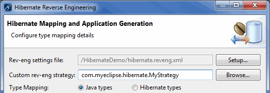 | 类型映射 | 确定在字段映射的type属性中使用Java还是Hibernate类型,例如java.lang.String vs. string。(仅在此向导第3页的“Customized Type Mappings”列表中找不到更特定的设置时,才使用此设置。) |