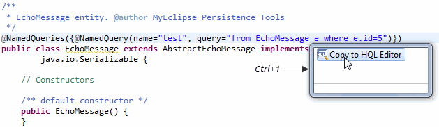 如果您正在编辑一个NamedQuery注释,可以在查询属性重调用quick fix(通常为CTRL + 1)来复制到HQL Editor。这将打开HQL编辑器,并使用查询字符串对其进行初始化。