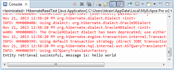 }在资源管理器中右键单击HibernateReadTest.java文件,然后选择 Run > Run As > Java Application。将打开“Console”视图,如果测试成功,您将看到如下图所示的输出。