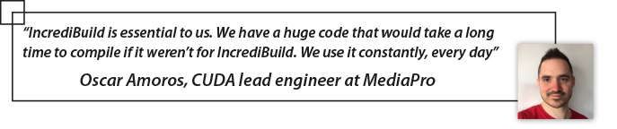 Amoros 称:“我们在开发人员用于开发C++/CUDA应用程序的机器上安装了Incredibuild。” 通过这种方式,IncrediBuild立即掌控了所有安装机器上未充分利用的CPU周期,并在它们之间分配相关任务,从而将编译时间缩短了85%,并大幅增加了MediaPro每天的提交和构建数量。“过去,编译整个Visual Studio项目(包括测试在内)需要1小时15分钟。但现在包括编译测试在内,只需要12分钟。”