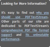 PDFTextStream was built from the ground up specifically to meet the most stringent PDF text and metadata content extraction requirements. Its API is comprehensive, and includes the following features: