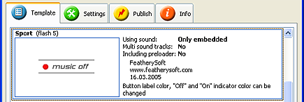 Template tab - choose a template for your Flash music web player from the template list. New Flash sound player templates are available at Player Templates page. Beginning with version 2.2 sorting the player template list by name, date or type of using is available.
