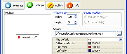 you can choose size, button color or button picture color, select any music MP3 files and sound location: either to include the music file into the player or use an external file or set a link to radio with MPEG audio stream format supporting.