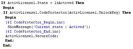You can protect fragments of your source code and execute them only when your software is activated. Otherwise, your code is protected against reverse-engineering. The user needs a valid Unlock Key to decrypt all protected blocks.