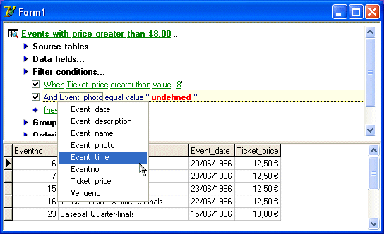 Query Studio provides an easy way to give users access to powerfull queries without requiring any knowledge about SQL. Users can setup complex queries in an almost natural language way with Query Studio. Dropping the component VisualQuery on the form and connect to the database opens the visual query power of Query Studio.