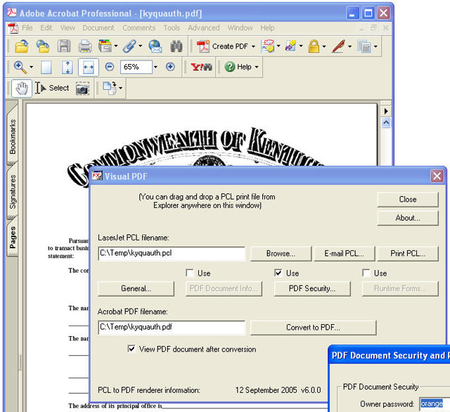 Pcl2pdf for Windows includes Windows 32 bit command line (console), DLL and ActiveX OCX conversion components. Visual PDF is available as the Windows interactive "GUI" standalone implementation.