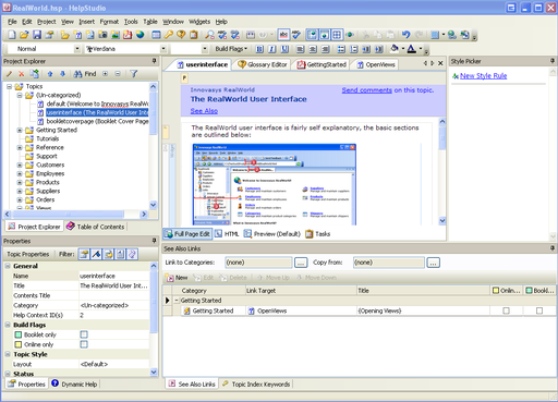 The HelpStudio user interface is intuitive and full of time saving and productivity features designed to make Help Authoring an enjoyable experience. Creating the Table of Contents or Glossary, adding Index Keywords and See Also Links, capturing screenshots, adding drop down sections or tip boxes to content and designing PDF booklets are all fully integrated and simply achieved using a few clicks or drag and drop.